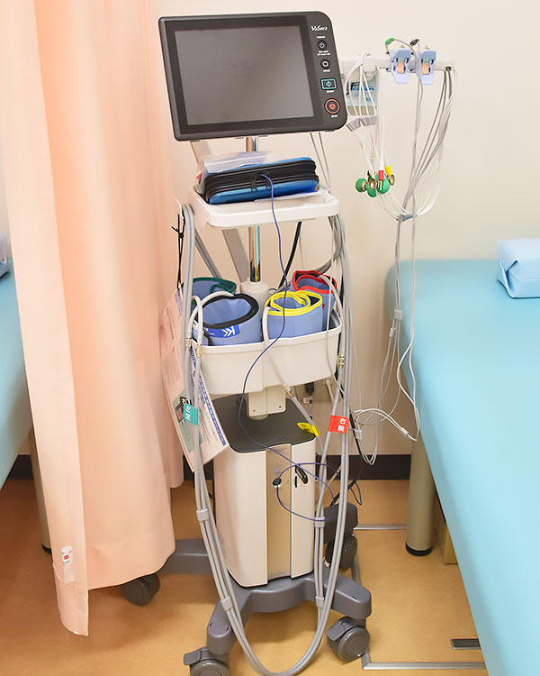 一台で心電図検査と血圧脈波検査が可能です。動脈の硬さや詰まり具合を測定することができますので、動脈硬化が気になる方はご相談ください。